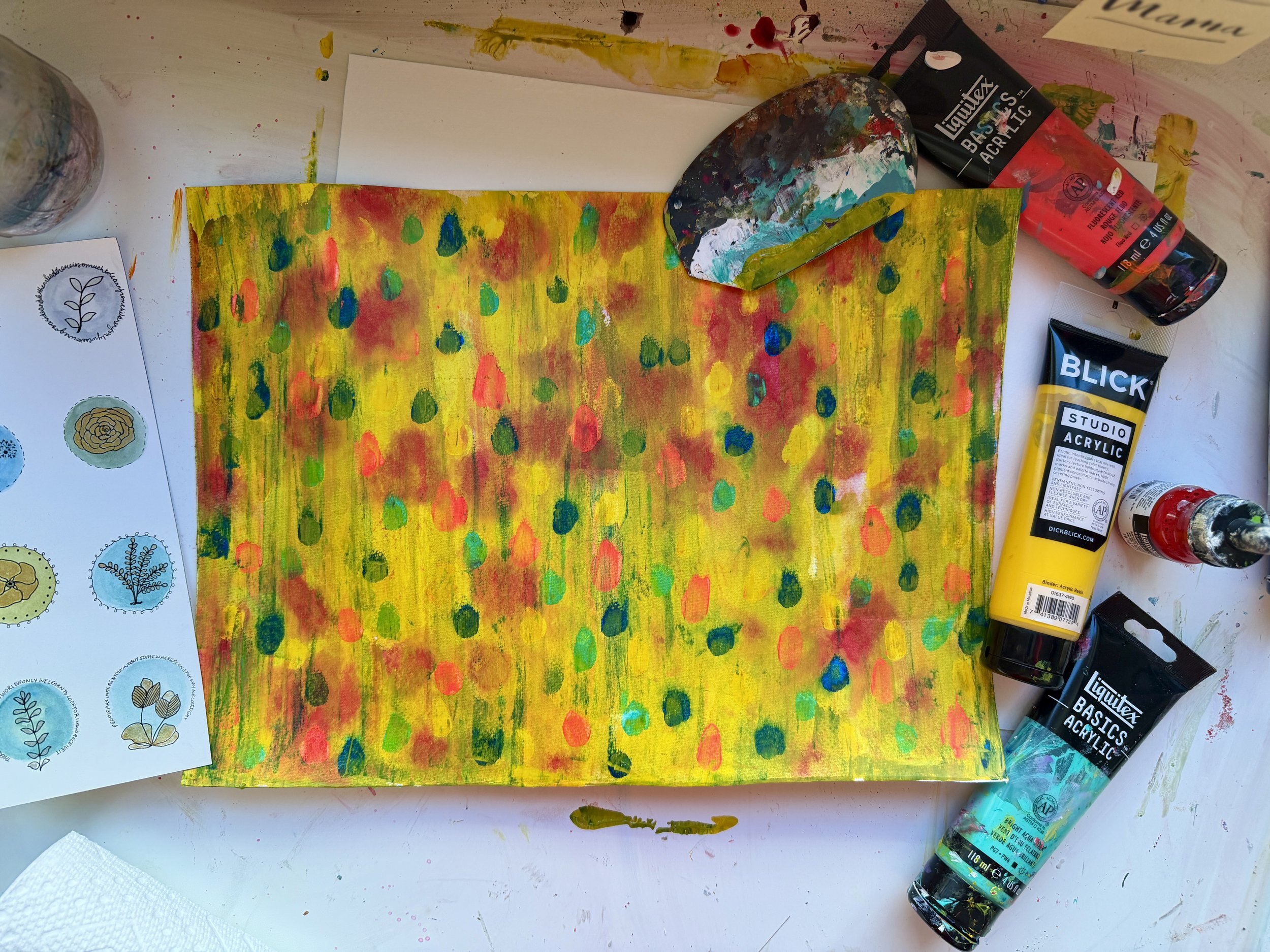 Whatever was within arm’s reach. I finger-painted with fluorescent red and yellow on watercolor paper. Someone tore paper — just tore it, slowly, while listening — and found it the most calming thing they’d done all week. Someone made watercolor circles and watched them bleed into each other. Someone pulled out supplies they hadn’t touched in months.